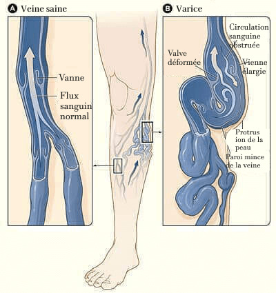 Formation d'une varice. Veine fonctionnant normalement sans anomalie de la valve veineuse (A). Veines variqueuses avec une valve déformée, un flux sanguin anormal et des parois veineuses fines et visibles (B)